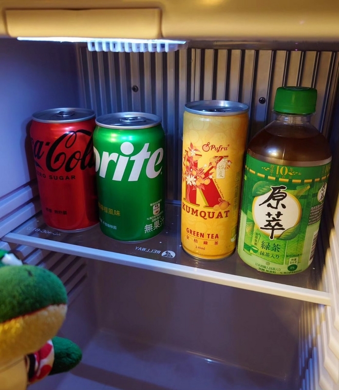 特典はフロントでお菓子とジュースを1つずついただきました。またそれ以外でも皆さんに、冷蔵庫の中の飲み物はフリーだそう。ドリンクは4本あり毎日補充されました。